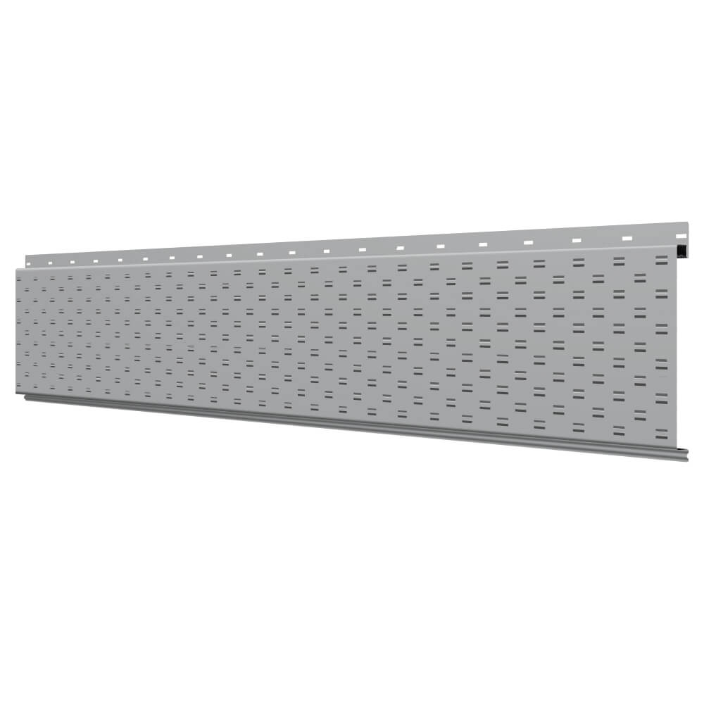 Линеарная потолочно-стеновая панель с ПЕРФОРАЦИЕЙ для вентиляции цвет RAL7004 Серый применяется в качестве софитов для подшивы крыши, наружной и внутренней отделки потолков, стен, фронтонов фасада дома в Кемерове.