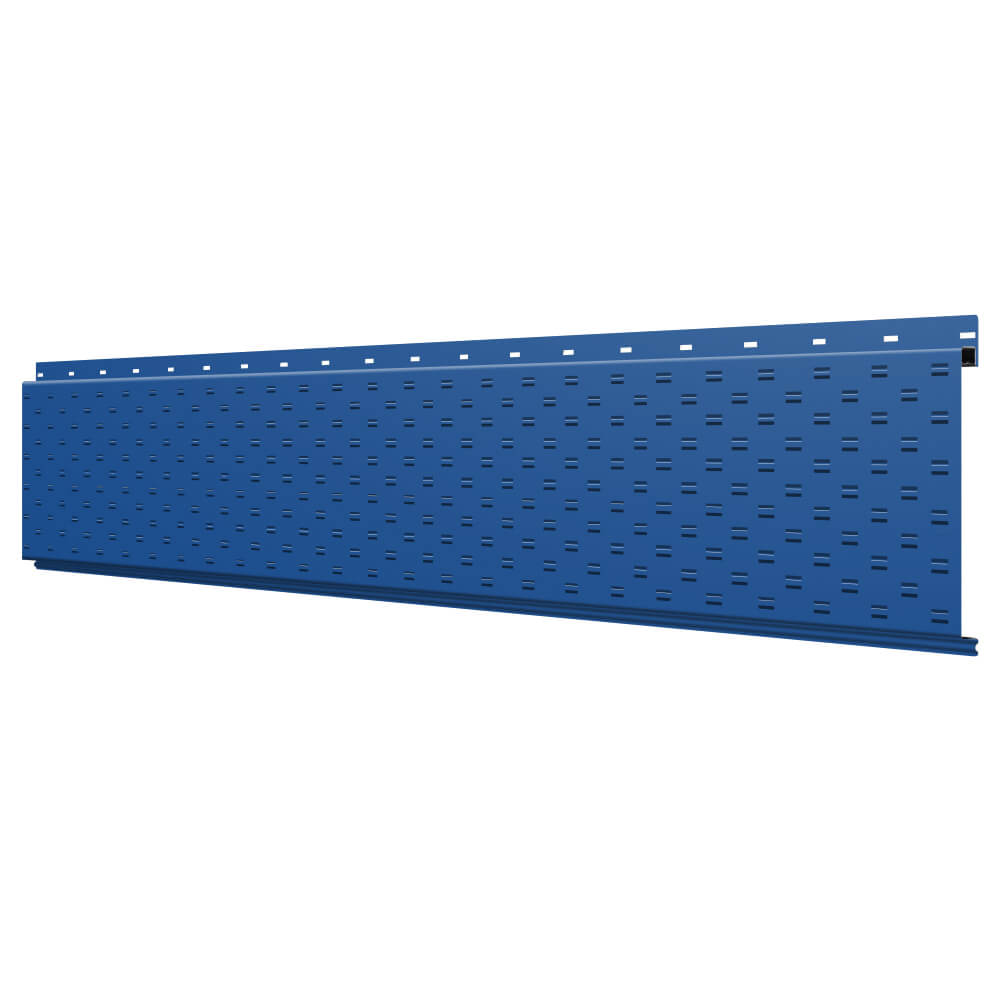 Линеарная потолочно-стеновая панель с ПЕРФОРАЦИЕЙ для вентиляции цвет RAL5005 Синий Сигнал применяется в качестве софитов для подшивы крыши, наружной и внутренней отделки потолков, стен, фронтонов фасада дома в Кемерове.