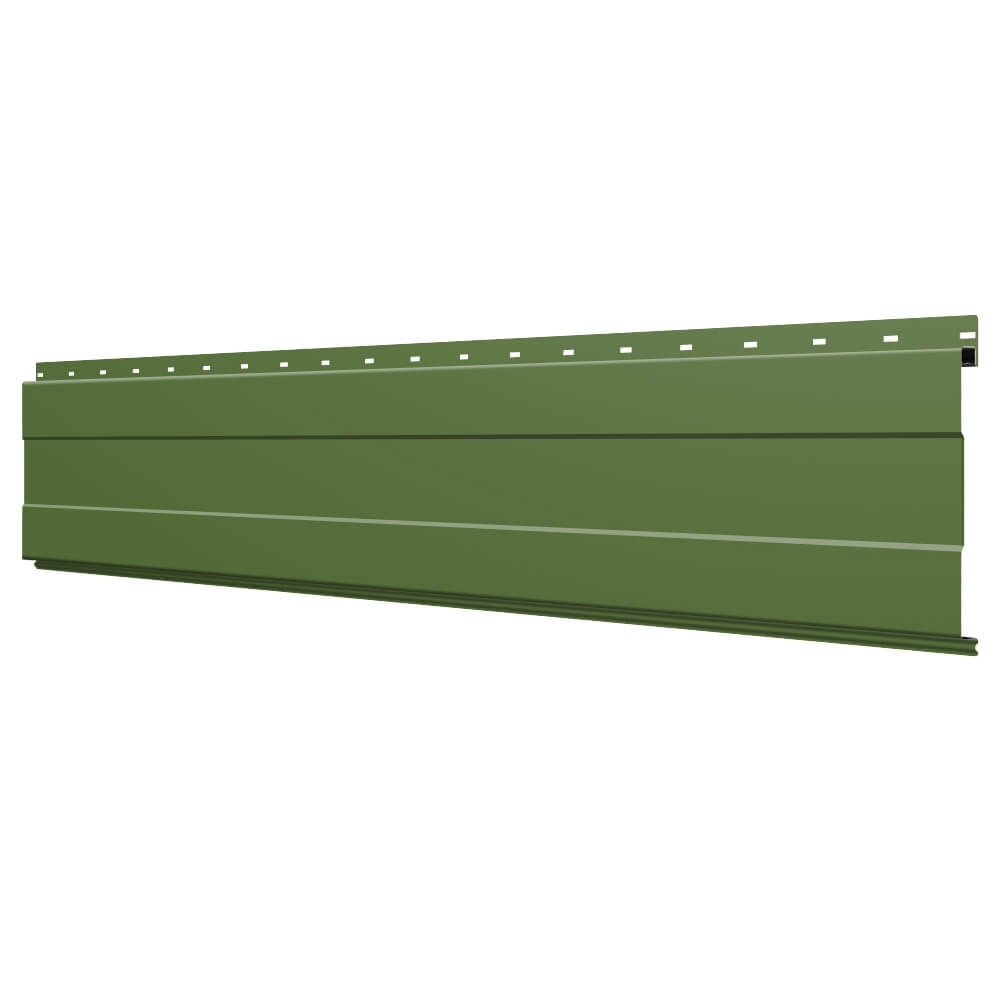 Линеарная потолочно-стеновая панель с ПОЛОСОЙ усиленная цвет RAL6002 Зеленый Лист применяется в качестве софитов для подшивы крыши, наружной и внутренней отделки потолков, стен, фронтонов фасада дома в Кемерове.